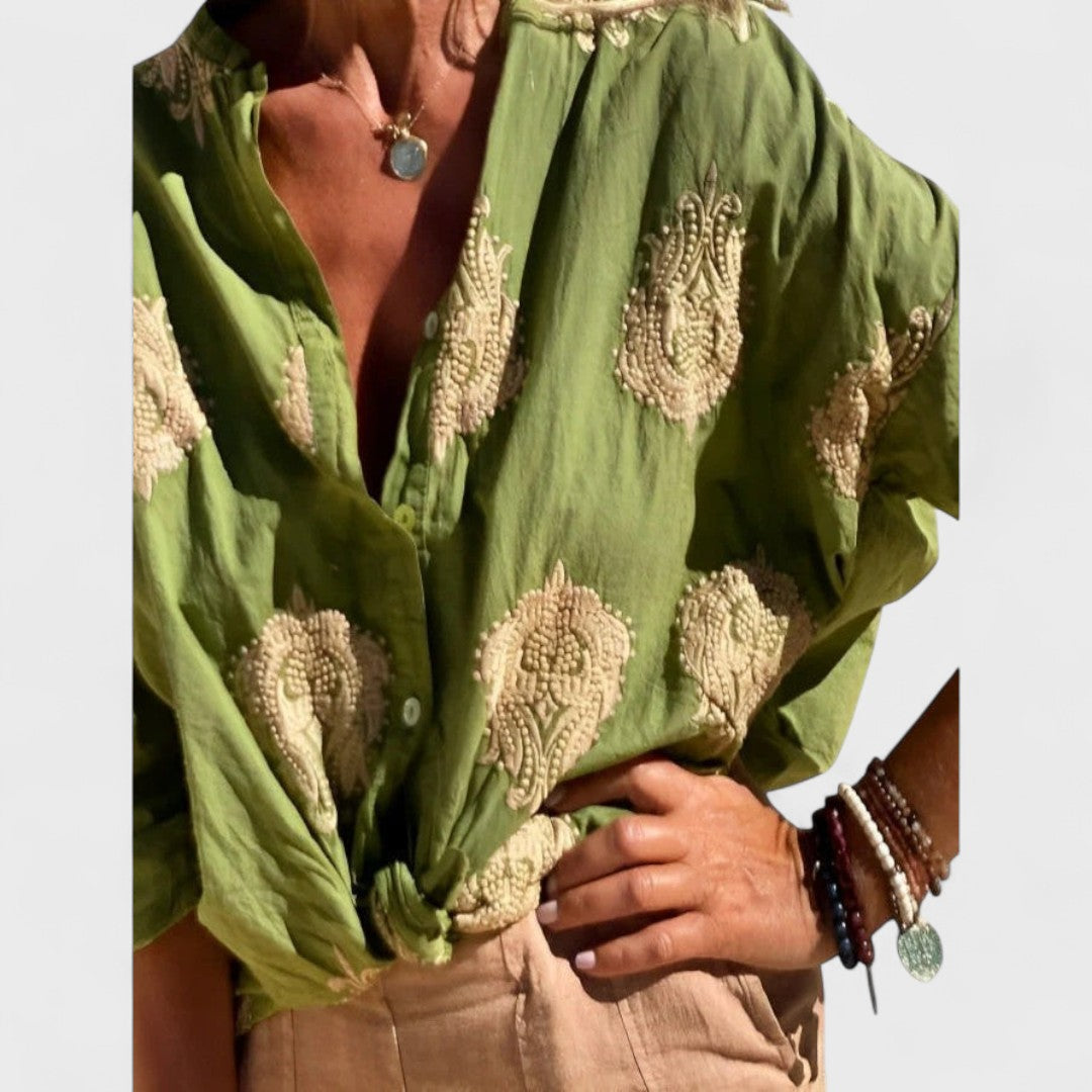 Tato blůza je ideální volbou pro ženy, které hledají kombinaci pohodlí a jedinečného stylu. Je vyrobena z lehkého a vzdušného materiálu, který je příjemný na nošení, a má jedinečný orientální vzor, který dodá vašemu outfitu osobitý a elegantní nádech. Její volný střih je pohodlný a lichotí každé postavě. Hodí se na každodenní nošení, do kanceláře nebo na procházky.