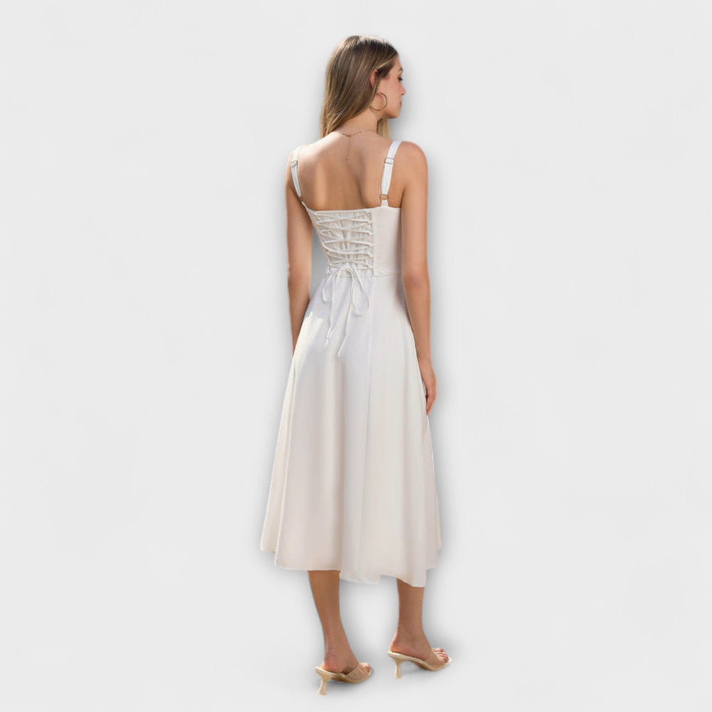 Rebecca - Elegantní bílá saténová midi šaty s výstřihem do V