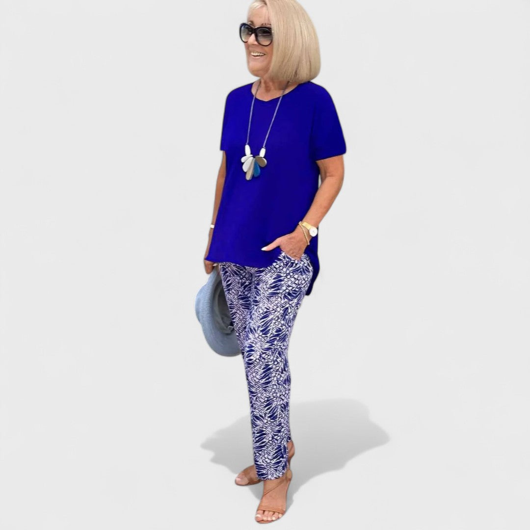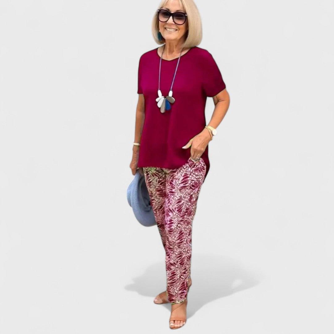Tato dvoudílná souprava je dokonalým spojením elegance a komfortu. Její lehký a vzdušný materiál je příjemný na dotek a zaručuje, že se v ní budete cítit skvěle po celý den. Krásně tvarovaný střih s širokými kalhotami a stylovým topem vytváří sofistikovanou, a přesto uvolněnou siluetu, která se hodí pro každou příležitost.